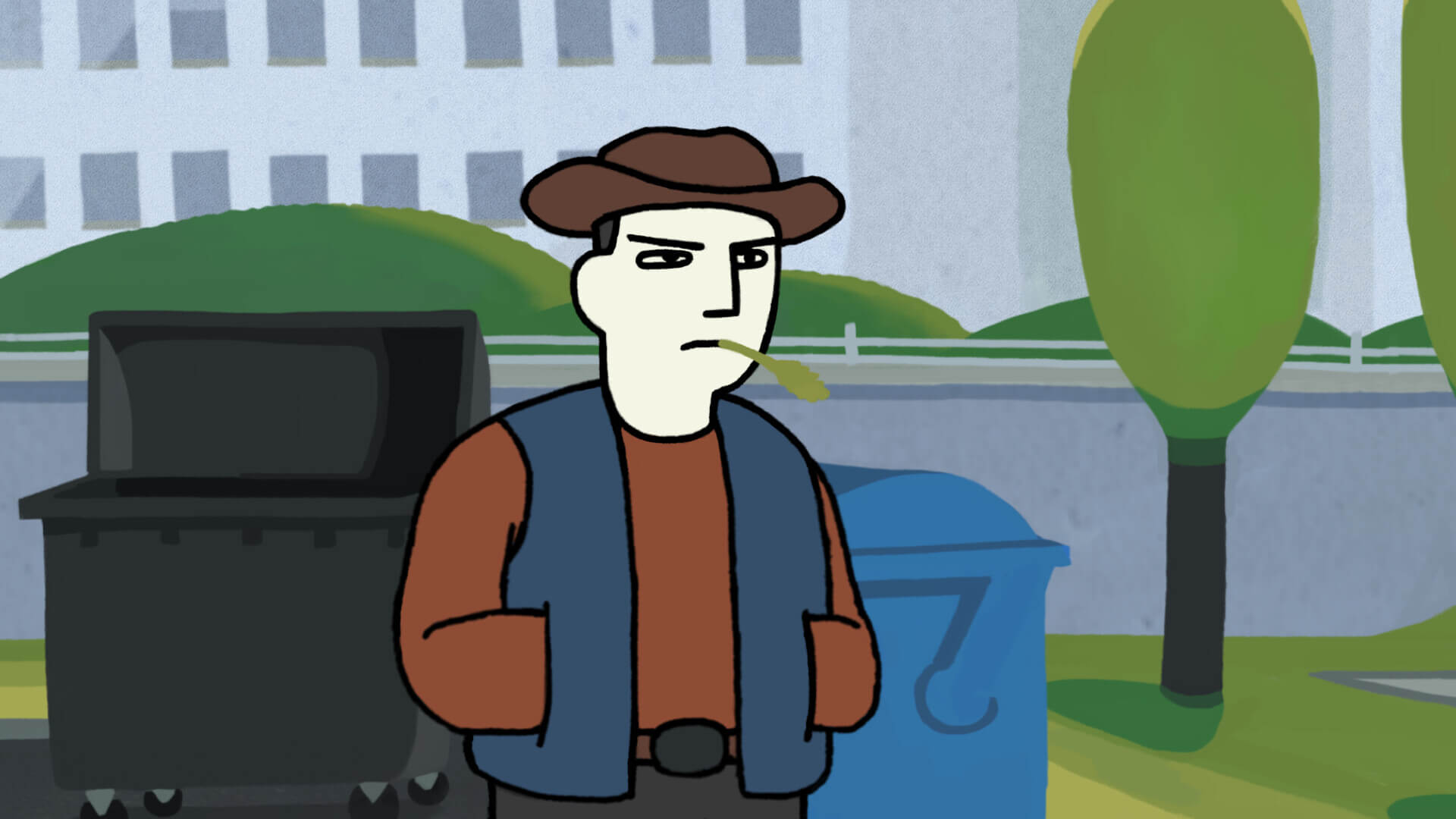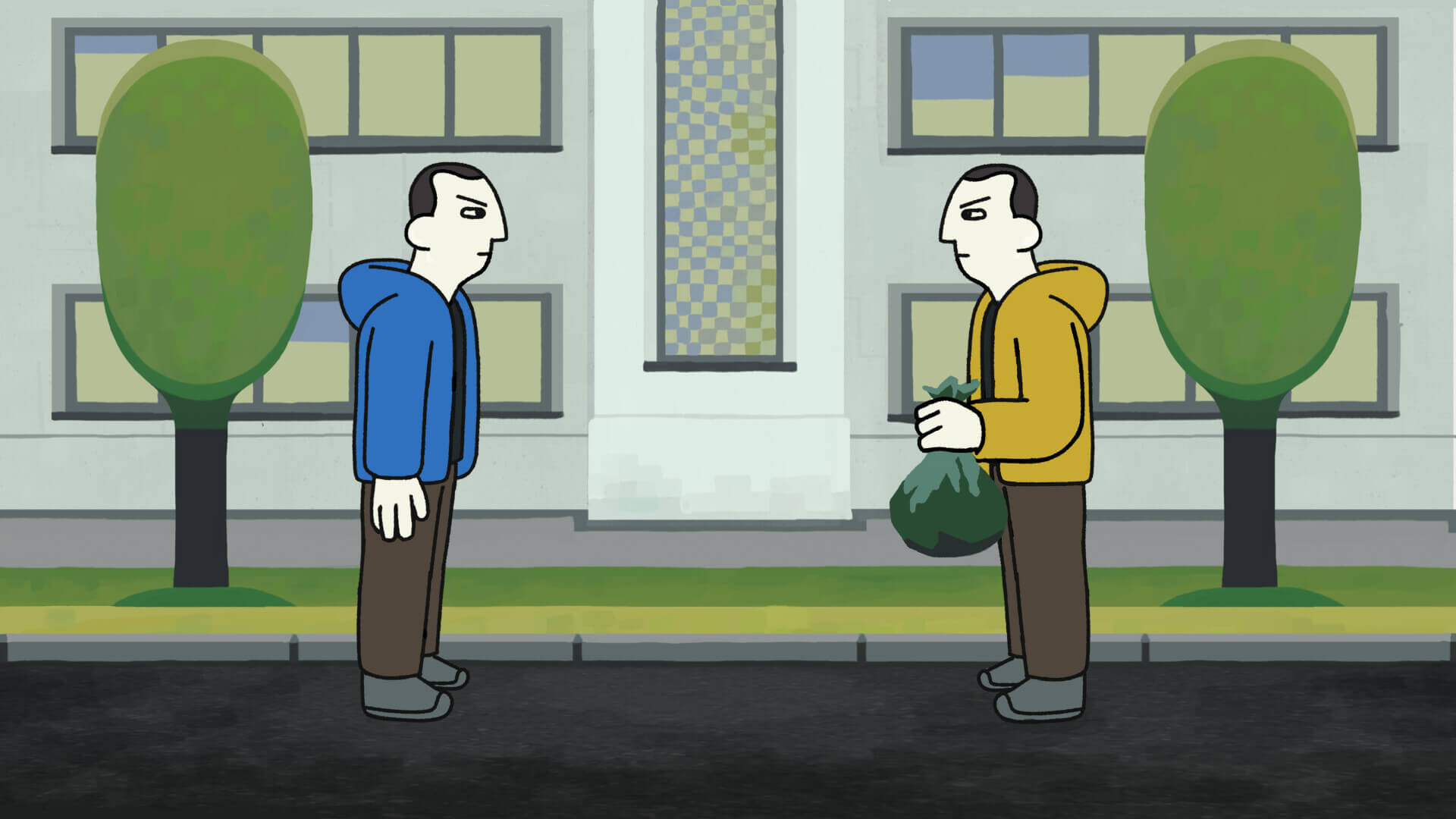 The paths of two middle aged men collide near a trash can. Their following interaction is brief, but it leaves both of them with a serious identity crisis.