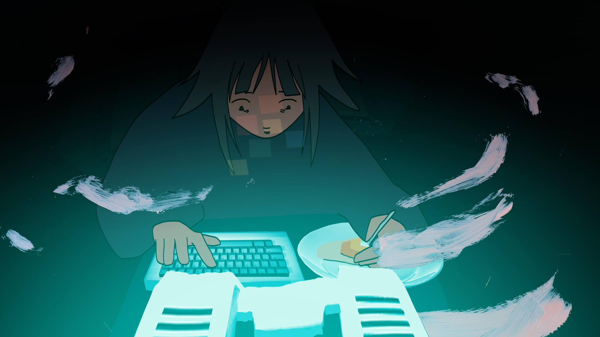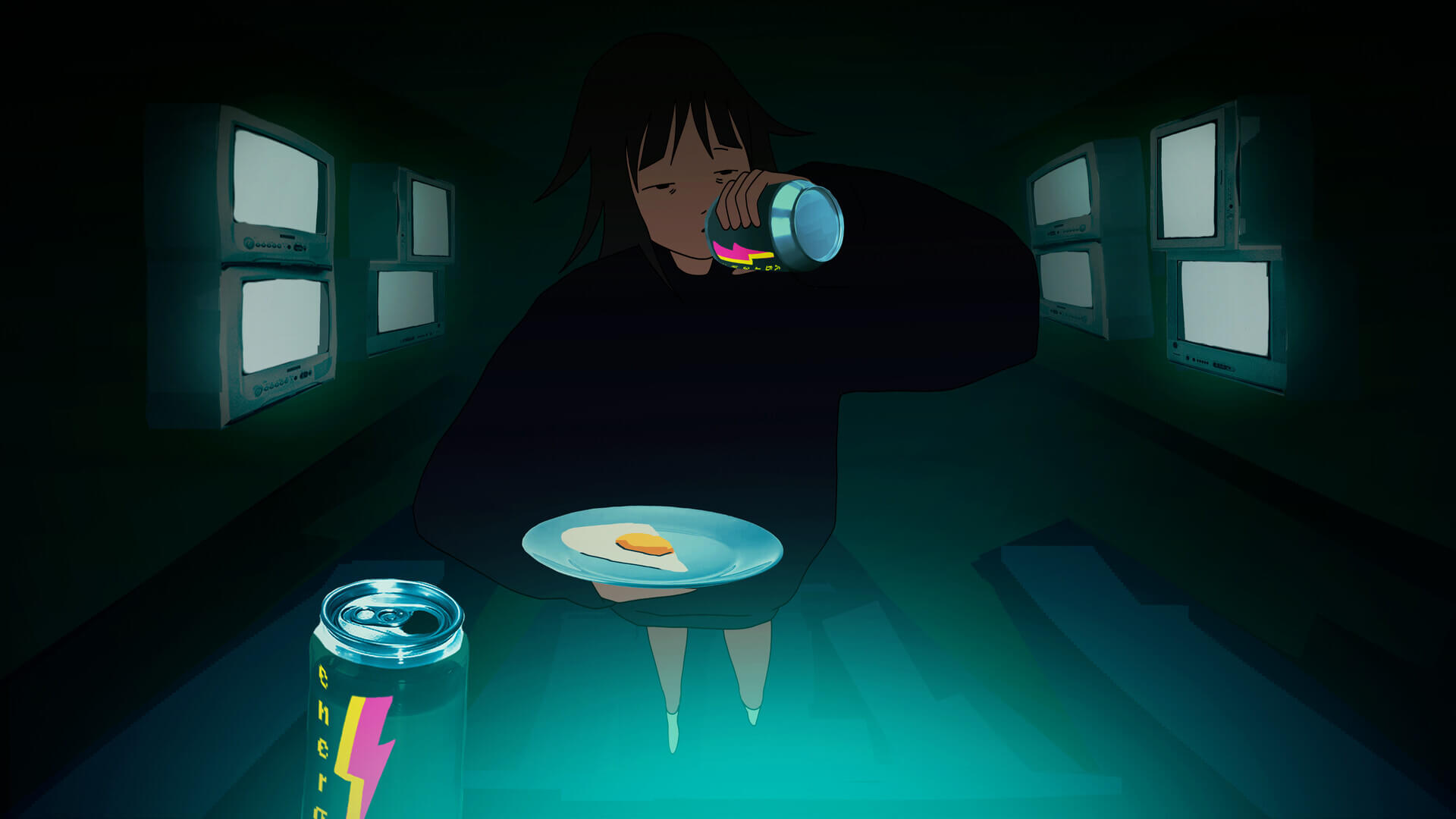 The unhappy protagonist’s life is consumed by relentless work, fueled by energy drinks. A brief interaction with a self-checkout machine transports her into a dreamlike world where anything seems possible. An escape from the hardships of everyday life into a technological world free from fear and responsibility gives her a sense of freedom and ease. The lines between everyday life and fantasy begin to blur. While technology offers an alluring freedom from obligation, it also forces her to confront a deeper question: what is her place in a world driven by total automation?